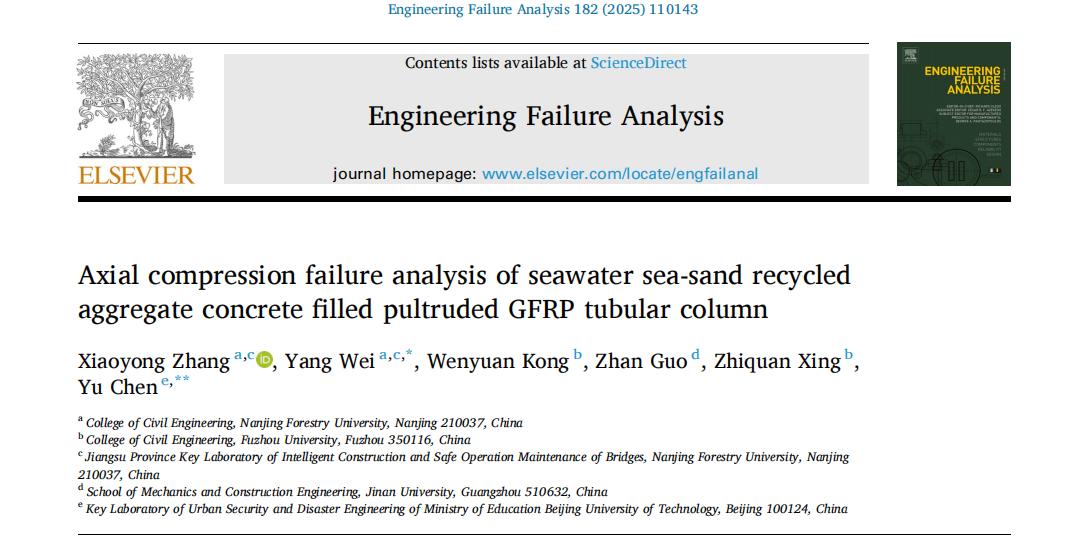 近日,麻豆av 张晓勇老师在结构工程领域国际权威期刊《Engineering Failure Analysis》(中科院2区)发表了研究成果(Axial compression failure analysis of seawater sea-sand recycled aggregate concrete filled pultruded GFRP tubular column)。张晓勇老师为第一作者,魏洋教授和北京工业大学陈誉教授为通讯作者,麻豆av为第一完成单位。该成果得到了国家自然科学基金和江苏省自然科学基金等项目的资助。
