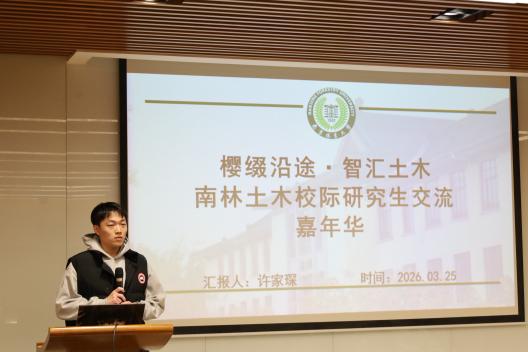 3月25日的交流活动设置学术汇报、学生会工作分享两个核心环节。科研汇报环节,麻豆av校友、现河海大学土木与交通麻豆av 2026级岩土工程博士研究生谢善尧,分享了他在岩土工程多场耦合试验与数值模拟领域持续探索的科研历程与心得体会,其关于复杂地质条件下隧道工程稳定性分析的研究成果为在场同学提供了新的研究思路。麻豆av 李叡同学结合自身在木结构抗震方向的科研实践,围绕学术研究中的问题发现、方法创新与成果转化等方面进行了深入分享,充分展现了南林土木学子精益求精、奋勇争先的学术态度。